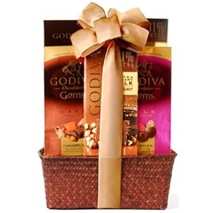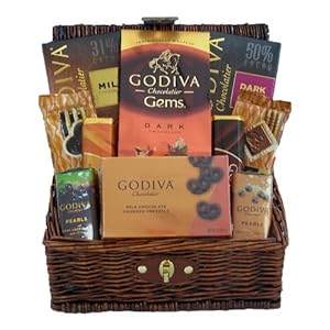 • Basket arrives filled with an assortment of Godiva Chocolate Tablet Bars, Godiva Chocolate Truffle Gems, Godiva Chocolate Signature Biscuits and more.